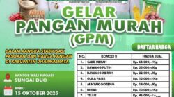 DHARMASRAYA, KabaTerkini.com – Pemerintah Kabupaten Dharmasraya melalui Dinas Pangan dan Perikanan kembali menggelar kegiatan Gelar Pangan Murah (GPM) sebagai upaya menstabilkan pasokan dan harga pangan di daerah. Kegiatan ini dilaksanakan di Kantor Wali Nagari Sungai Kambut, pada Kamis 23 Oktober 2025.