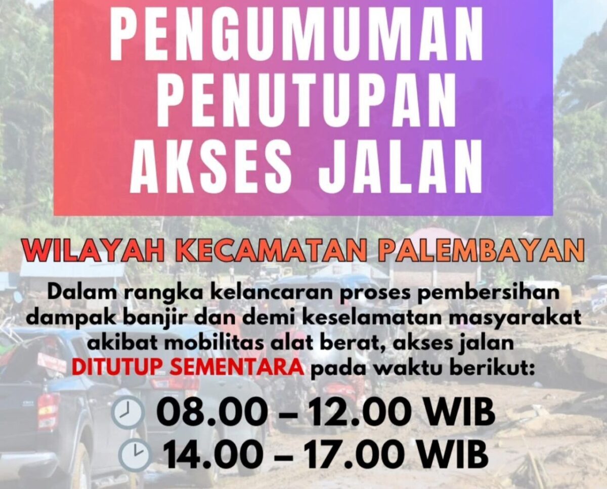 AGAM, KabaTerkini.com – Sehubungan dengan proses pembersihan dampak banjir serta untuk menjamin keselamatan masyarakat akibat mobilitas alat berat, akses jalan di wilayah Kecamatan Palembayan ditutup sementara pada waktu berikut: