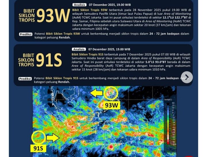 “Perlu diwaspadai intensitas hujan pada tanggal 11, 12, dan 16 Desember akibat pengaruh dari Bibit Siklon Tropis 91S. Tapi, mohon tetap tenang, waspada, dan menjaga kesiapsiagaan karena potensi bibit siklon ini tumbuh menjadi siklon tropis ke daratan dalam kategori rendah,” kata Kepala BMKG Teuku Faisal Fathani dalam keterangannya, Rabu (10/12/25).