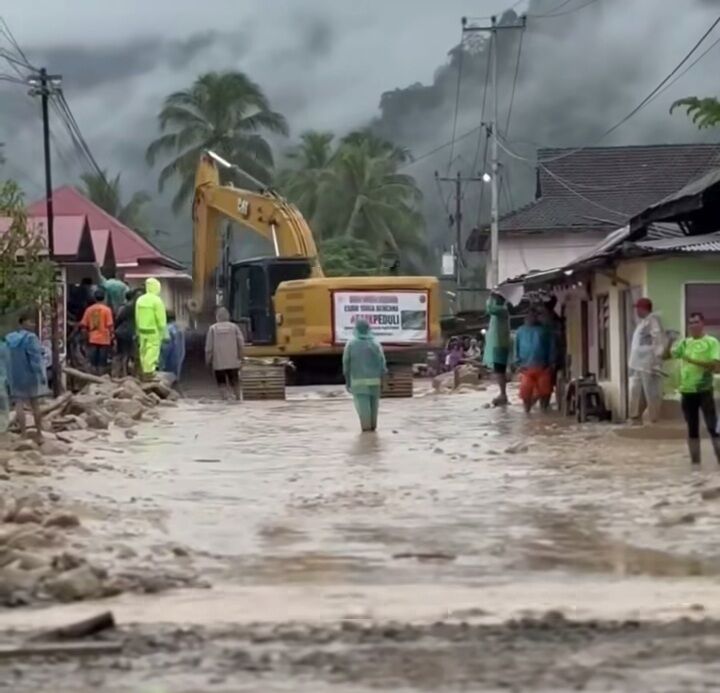Begitu hujan reda, alat berat bersama tim di lapangan melanjutkan proses pembersihan material di area Jembatan Muaro Pisang.