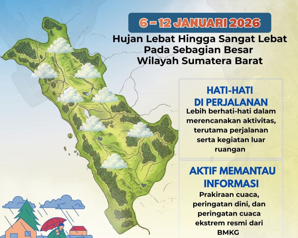 PADANG, KabaTerkini.com – BMKG memperkirakan wilayah Sumatera Barat akan mengalami hujan dengan intensitas deras hingga sangat deras yang disertai dengan kilat dan petir sampai 12 Januari 2026 mendatang.