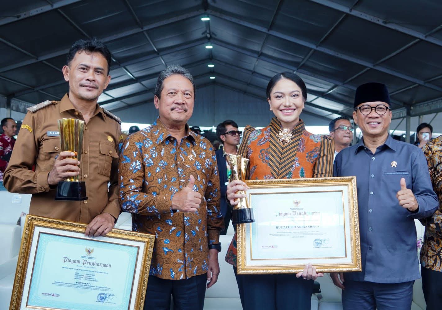 Penghargaan tersebut diserahkan langsung oleh Menteri Desa, Pembangunan Daerah Tertinggal, dan Transmigrasi Republik Indonesia, Yandri Susanto, sebagai bentuk apresiasi atas keberhasilan Pemerintah Kabupaten Dharmasraya dalam melakukan pembinaan dan pengawasan terhadap penyelenggaraan pemerintahan desa hingga mampu berprestasi di tingkat nasional.