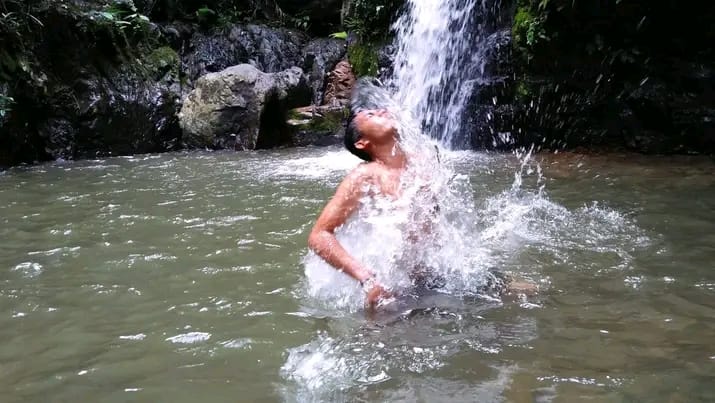 Setelah melewati perjuangan sandal dan “teror” kerbau, pepohonan di depan mereka mendadak terbuka. Sebuah tirai air raksasa jatuh dari ketinggian tebing batu yang megah. Airnya jernih mengkilap seperti berlian yang mencair, menghantam kolam alami di bawahnya hingga menciptakan uap air yang sejuk dan menyegarkan.