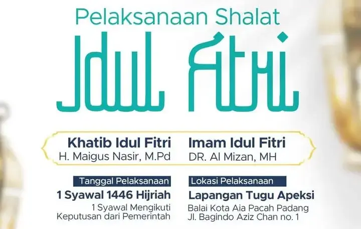 PADANG, KABATERKINI.Com – Wakil Wali Kota Padang, Maigus Nasir, akan bertindak sebagai khatib dalam pelaksanaan Salat Idulfitri 1446 Hijriah, sementara itu, Dr. Al-Mizan akan bertugas sebagai imam yang dijadwalkan berlangsung pada pukul 07.00 WIB yang digelar di kawasan Tugu Apeksi, Balai Kota Aia Pacah.
