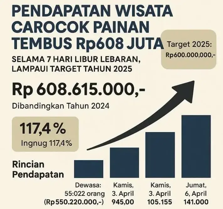 Dari data resmi yang dirilis Dinas Komunikasi dan Informasi setempat, total pendapatan selama sepekan libur Lebaran mencapai Rp608 juta. Pendapatan tersebut langsung mencapai target tahunan PAD dari sektor objek wisata Pesisir Selatan.