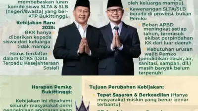 Pemerintah Kota Bukittinggi telah melakukan evaluasi terhadap kebijakan Bantuan Keuangan Khusus (BKK) dan hibah ke Pemerintah Provinsi Sumatera Barat yang digunakan untuk membebaskan iuran uang komite bagi siswa seluruh SLTA dan SLB (negeri/swasta) di Kota Bukiittinggi yang ber KTP Kota Bukittinggi.