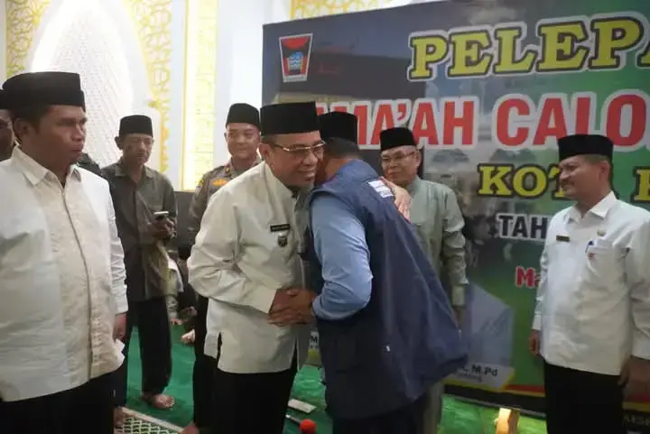 Jamaah calon haji dilepas keberangkatannya oleh Wakil Wali Kota Padang, Maigus Nasir di Masjid Agung Nurul Iman, Jumat (2/5/2025).