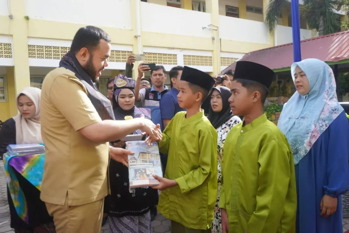 Fachry, sang anak, tampak malu-malu tapi matanya bersinar saat menerima langsung paket LKS dari wali kota.