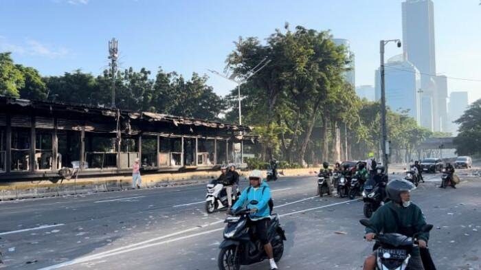 Halte bus TransJakarta yang tepat berada di depan Polda Metro Jaya juga tak luput dari amukan massa. Halte itu terlihat dibakar dan dirusak.