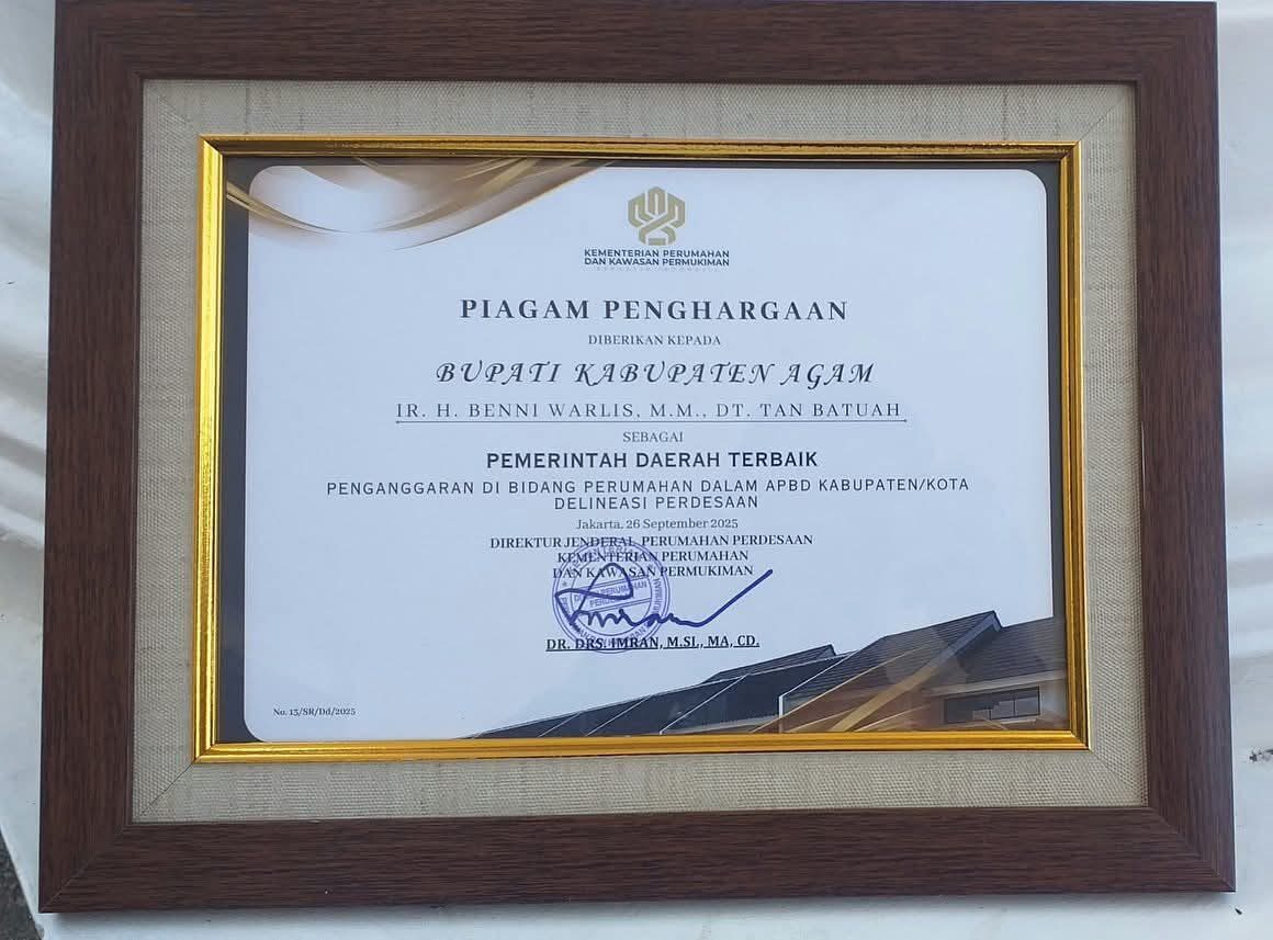 AGAM, KabaTerkini.com – Pemerintah Kabupaten Agam berhasil meraih penghargaan sebagai pemerintah daerah terbaik dalam penganggaran bidang perumahan di APBD 2025 untuk kawasan pedesaan.