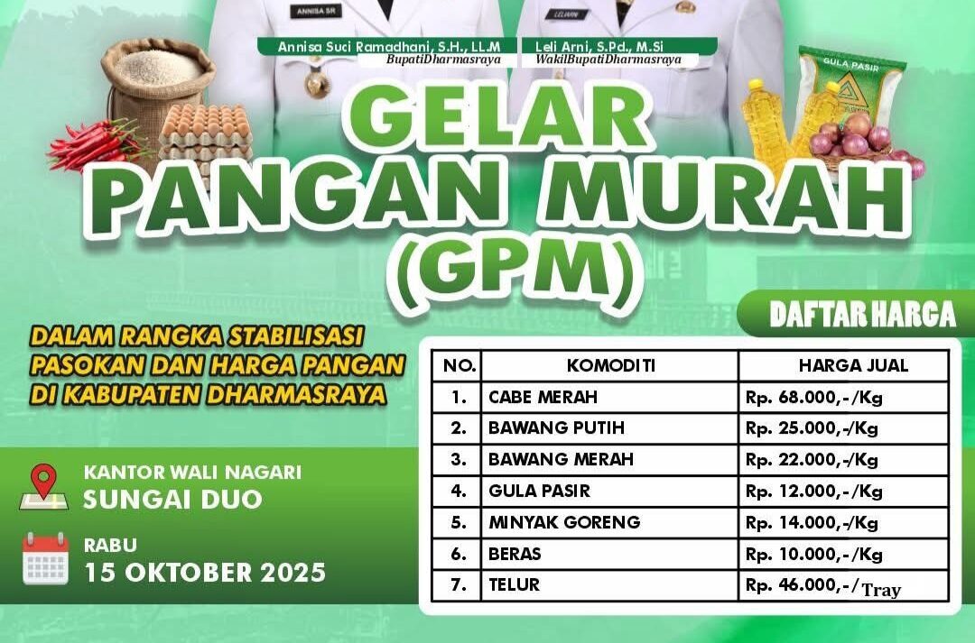 DHARMASRAYA, KabaTerkini.com – Dalam upaya menekan laju inflasi yang cenderung meningkat dalam beberapa bulan terakhir, Pemerintah Kabupaten Dharmasraya melalui Dinas Pangan dan Perikanan (Dispakan) akan menggelar Gerakan Pangan Murah (GPM) di dua lokasi berbeda pada bulan Oktober ini.