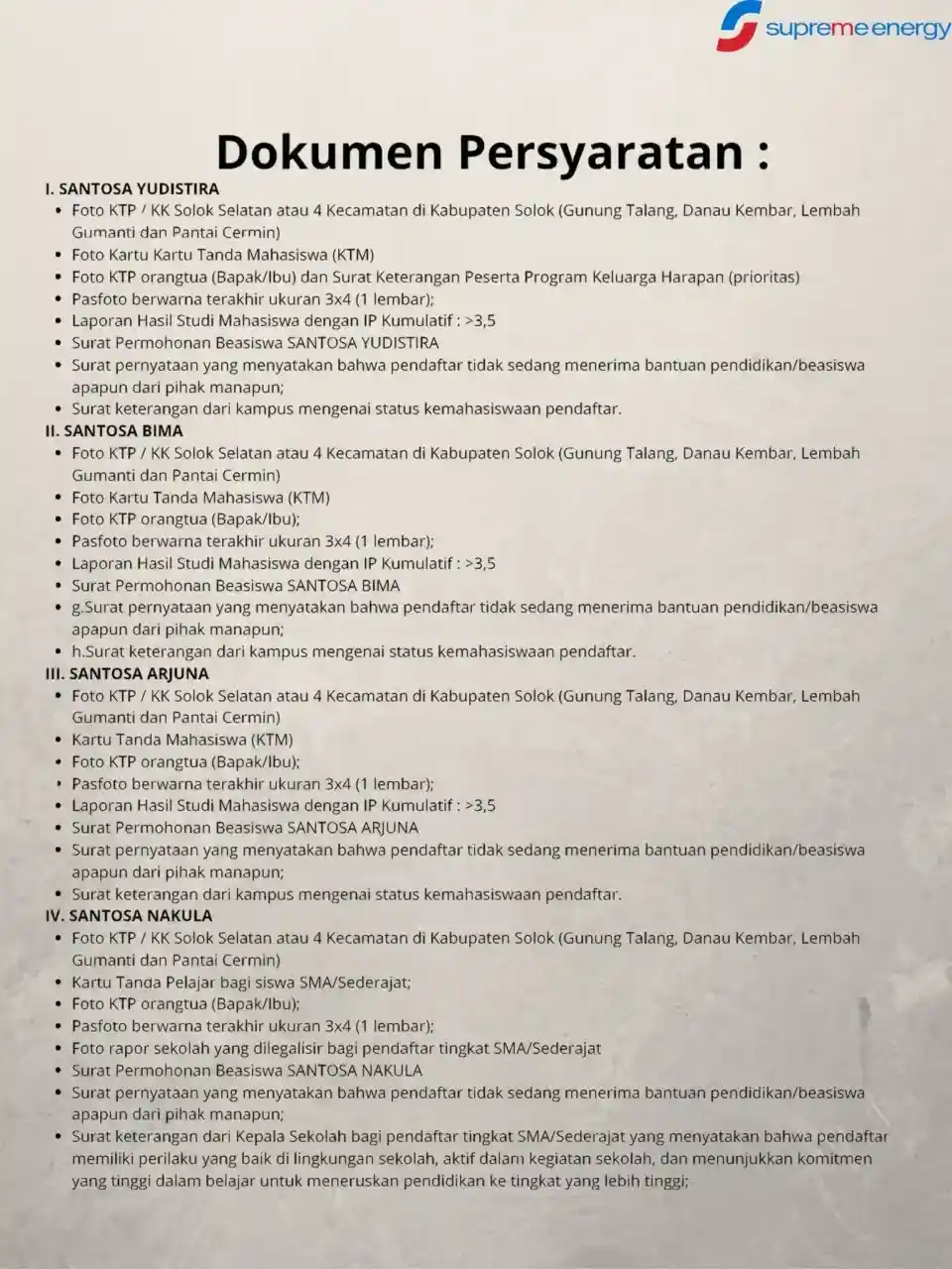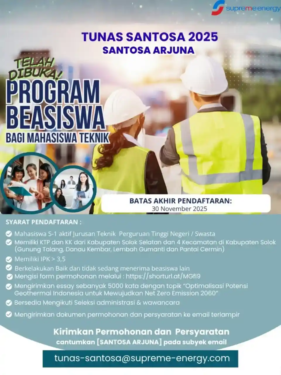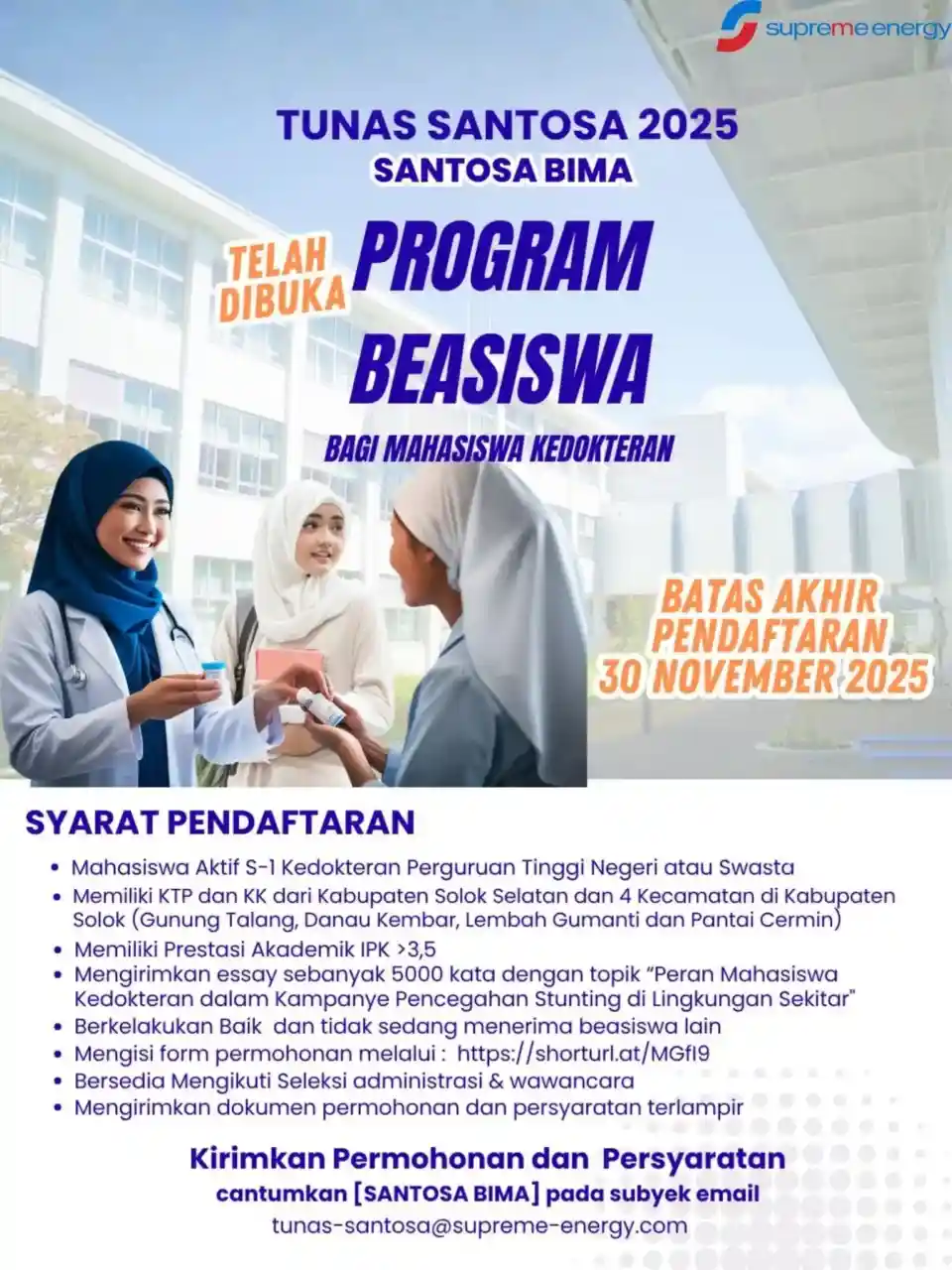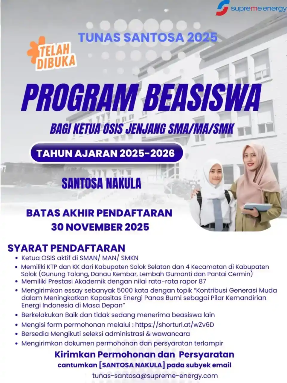 Beranda Pendidikan INFO BEASISWA: Jadwal, Syarat dan Cara Pendaftaran Beasiswa PT Supreme Energy Pendidikan INFO BEASISWA: Jadwal, Syarat dan Cara Pendaftaran Beasiswa PT Supreme Energy KABATerkini.comKamis, 13/11/2025 | 06:03 WIBKamis, 13/11/2025 | 06:06 WIB Sebelumnya Baca Juga Bupati Eka Putra: Peran Alumni Tak Hanya Bantu Sekolah, Namun Juga Pembangunan DaerahLaman: 1 2 Baca JugaMomen Spesial Hari Guru di Bukittinggi, Guru-Guru Bahasa Indonesia SMP Ciptakan Buku Puisi “Simfoni di Bawah Menara Jam Gadang”Membanggakan! MTsN 1 Pesisir Selatan Bertabur Prestasi di Batavia Marching Band Competition 2025Pesan Gubernur Bakar Semangat Anak Pulau Terpencil Mentawai yang Bersekolah di SMA Favorit PadangKolaborasi Dosen Sastra Unand dan UPI YPTK Padang Luncurkan Website Ensiklopedi Digital Peribahasa Minangkabau7 Siswa SD Unggul Terpadu Padang Pariaman Lolos Olimpiade PAI Sumatera BaratCanggih! Aplikasi MindQ Ciptaan Mahasiswa UNP Bantu Pembinaan Mental Siswa Secara Online
