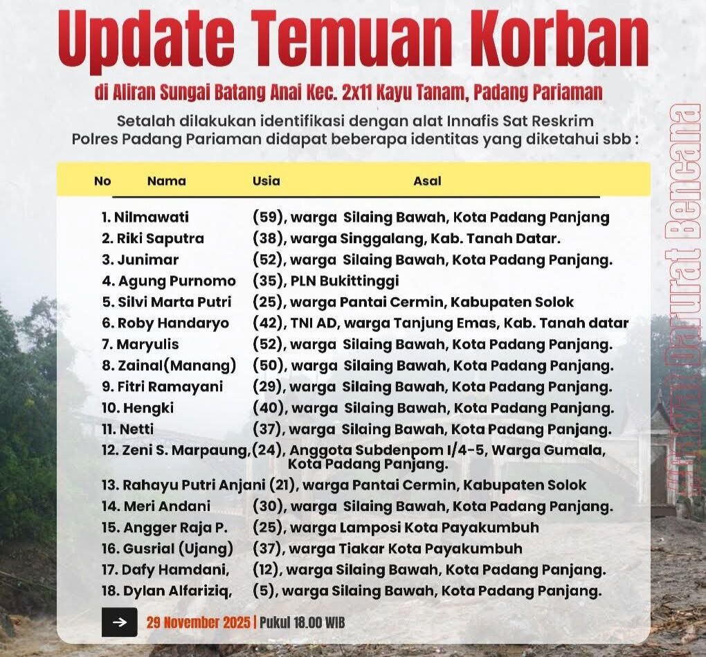 Wali Kota Padang Panjang, Hendri Arnis, yang turun langsung meninjau proses evakuasi, meminta warga dan keluarga korban agar tetap berada di area aman di bagian atas. Ia menegaskan keselamatan masyarakat menjadi prioritas utama.