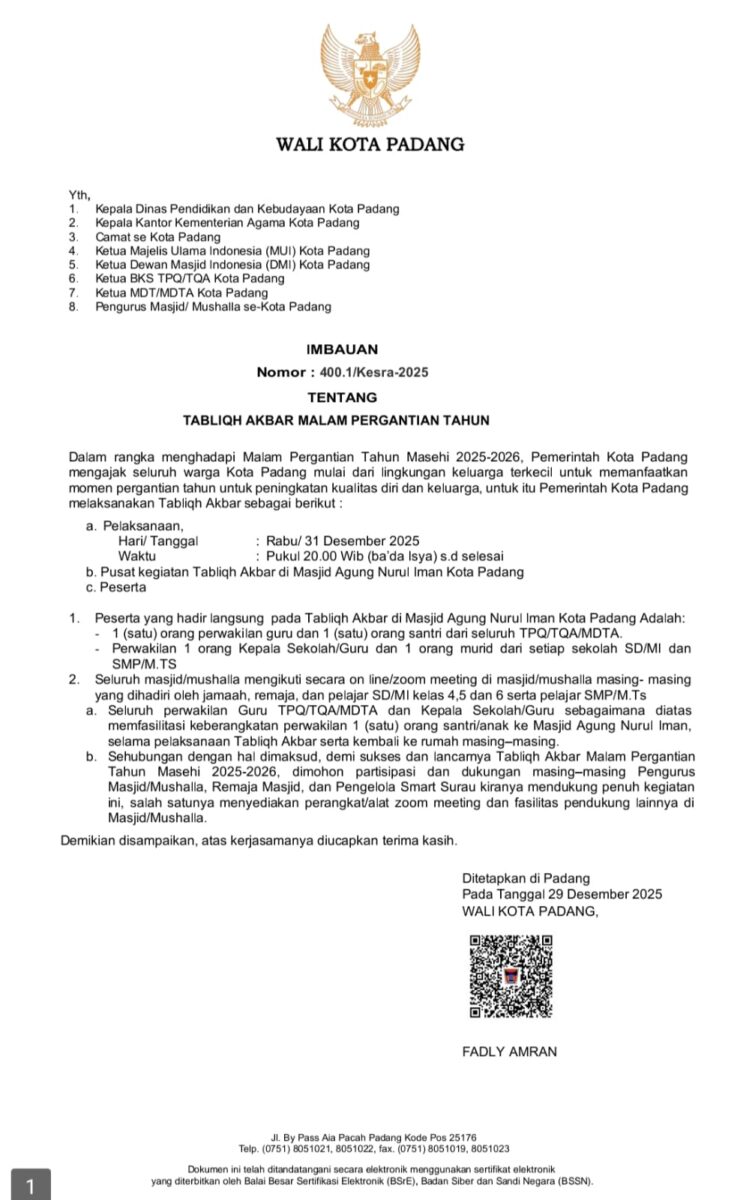 Beranda Terkini Imbauan untuk Satgas Smart Surau, Berikut Teknis Kegiatan Tabligh Akbar Tahun Baru di Padang Terkini Imbauan untuk Satgas Smart Surau, Berikut Teknis Kegiatan Tabligh Akbar Tahun Baru di PadangKABATerkini.com31 Desember 2025 | 08:15 WIB31 Desember 2025 | 09:13 WIB (*/001) Sebelumnya BACA JUGA Mall Terbesar di Sumatera Buka di Padang 29 Mei, Walikota Fadly Amran: Terima Kasih Basko Group!Laman: 1 2 Baca JugaMalam Tahun Baru! BMKG Warning Siaga Bencana Sejumlah Daerah di SumateraVIDEO: Detik-detik Kawasan Batu Busuk Kota Padang Kembali Dihantam Galodo!BREAKINGNEWS: Palembayan Kembali Diterjang Galodo! Jalan Putus, 3 Warga TertimbunKorban Banjir Bandang Sumbar, Sumut dan Aceh Dapat Bantuan Rp600 Ribu/BulanBREAKINGNEWS: Baru Saja Terjadi, Banjir dan Longsor Kembali Landa Kabupaten AgamLagi-lagi Kamar Kos! 5 Cewek + 4 Cowok Terjaring Razia Satpol PP Padang