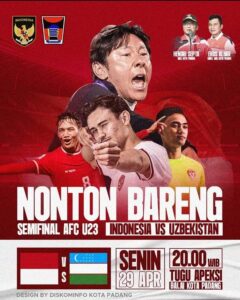 Sebagai bentuk dukungan terhadap Timnas Indonesia yang akan bertanding melawan Uzbekistan di ajang Semifinal AFC ASIAN CUP U-23 di Qatar 2024, pemerintah Daerah menggelar Nonton Bareng mulai pukul 20.00 wib besok malam, Senin (29/04/24).