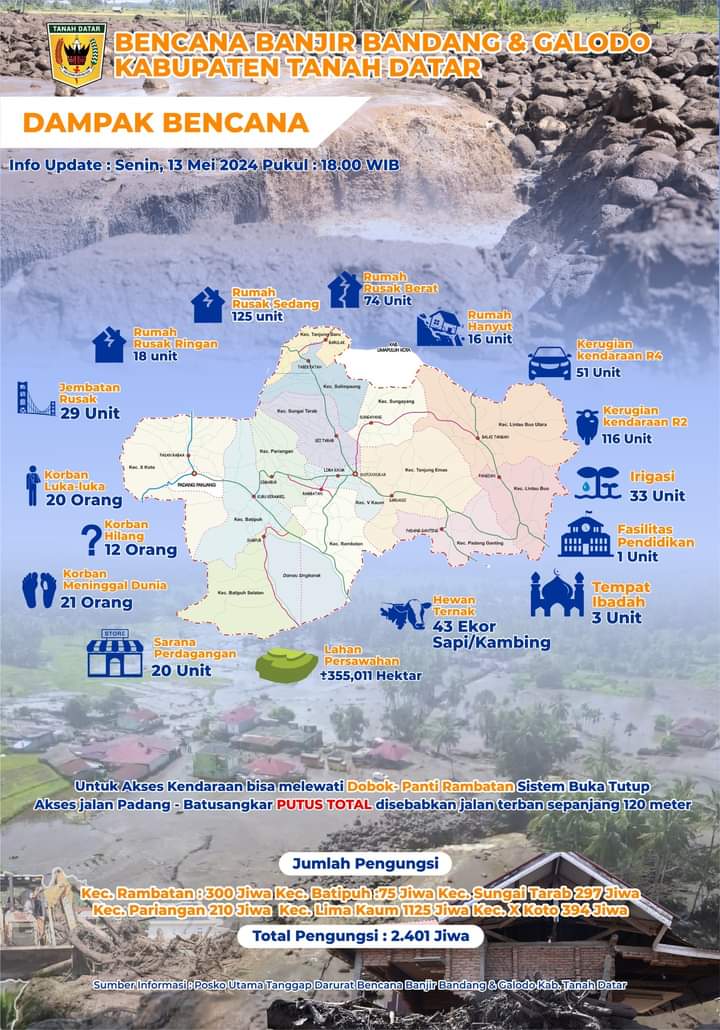 Berikut update data sementara kerugian dan korban jiwa banjir bandang di Kabupaten Tanah Datar Selasa, (14/05/24) pukul 08.00 wib.