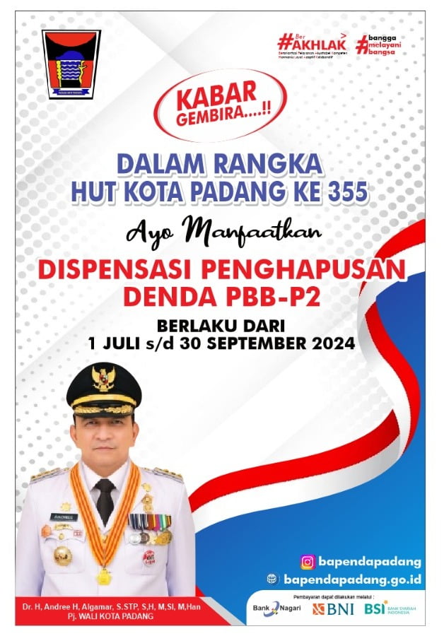 KABATERKINI.Com – Dalam rangka HUT Kota Padang ke-355 tepatnya 7 Agustus 2024, Pemko Padang kembali memberikan kado untuk warga kota. Kado yang diberikan berupa dispensasi penghapusan denda untuk Pajak Bumi Bangunan Perkotaan dan Pedesaan (PBB-P2) oleh Badan Pendapatan Daerah (Bapenda) Kota Padang.