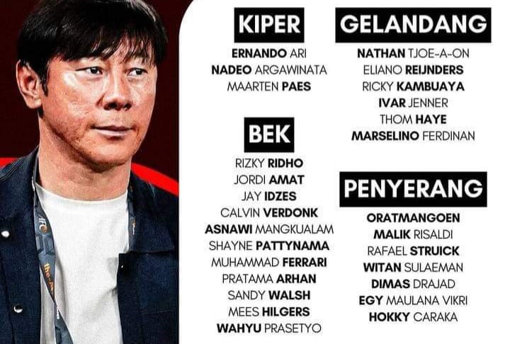 “Semuanya ada 27 pemain. Ini nanti semuanya kumpul langsung di Bahrain. Daftar 27 pemain ini sudah termasuk Mees Hilgers dan Eliano Reijnders,” kata Ketua Badan Tim Nasional (BTN) Sumardji kepada wartawan.